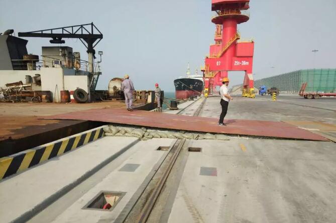 為做好首次大件設(shè)備接卸工作,集團公司高度重視,認真謀劃,先后召開3次裝卸流程技術(shù)調(diào)度會。結(jié)合碼頭承臺結(jié)構(gòu),積極制定船舶靠泊、護輪坎及軌道防護方案,準(zhǔn)確核算碼頭前沿承載負荷,并根據(jù)潮汐情況確定最佳的卸船時間,保證了貨物的安全接卸。