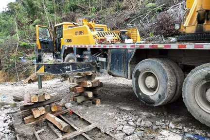 第三步:確認(rèn)吊車(chē)支腿安全,吊車(chē)支腿應(yīng)完全打開(kāi),支腿下方應(yīng)墊上枕木或鋼板。
