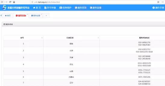 1)企業(yè)用戶成功注冊(cè)后,登錄網(wǎng)站,此時(shí)用戶尚不能進(jìn)行業(yè)務(wù)申請(qǐng)。應(yīng)電話聯(lián)系企業(yè)注冊(cè)省的協(xié)調(diào)人員申請(qǐng)核查企業(yè)資質(zhì),點(diǎn)擊頁(yè)眉處的【服務(wù)咨詢】,查詢本省協(xié)調(diào)員電話聯(lián)系。